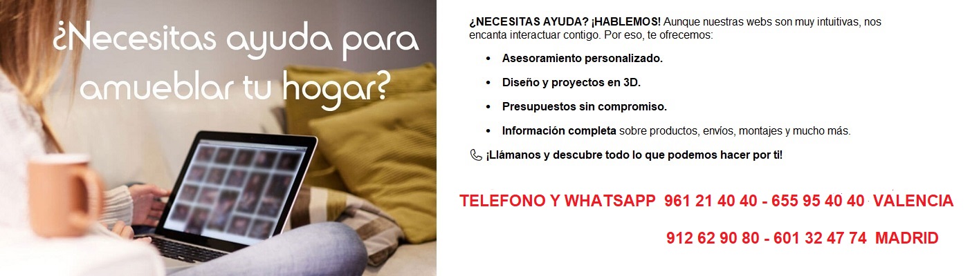 Nuestro deseo es que puedas amueblar y decorar tu casa en nuestra Tienda de muebles en Madrid, sin necesidad de perder tiempo en recorrer centros comerciales y establecimientos grandes pero sin un asesoramiento personalizado que nosotros te podemos ofrecer, para que no tengas que pagar a un decorador que no cuente con tus gustos a la hora de elegir los muebles de tu casa. Te podemos desarrollar un proyecto personalizado de decoración de la estancia que desees de tu casa, para que puedas ver el resultado final y así te resulte más sencillo tomar una decisión. Luego te entregamos todos tus muebles y te los montamos, sin coste a partir de 500€ de compra. Compara nuestros muebles con los de otras tiendas y verás que en Muebles Valencia® siempre conseguirás la mejor calidad y el mejor servicio al mejor precio.