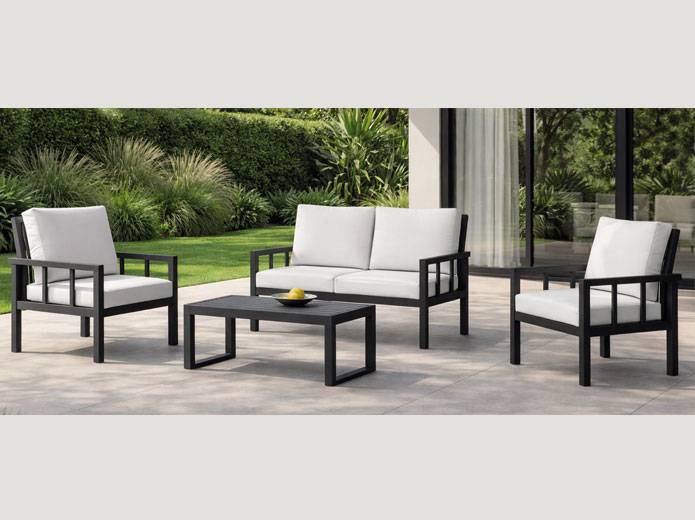Este set de muebles para terraza está formado por un sofá de exterior de tres plazas y dos sillones de exterior de una plaza. A lo que se suma una mesa de centro para terraza.