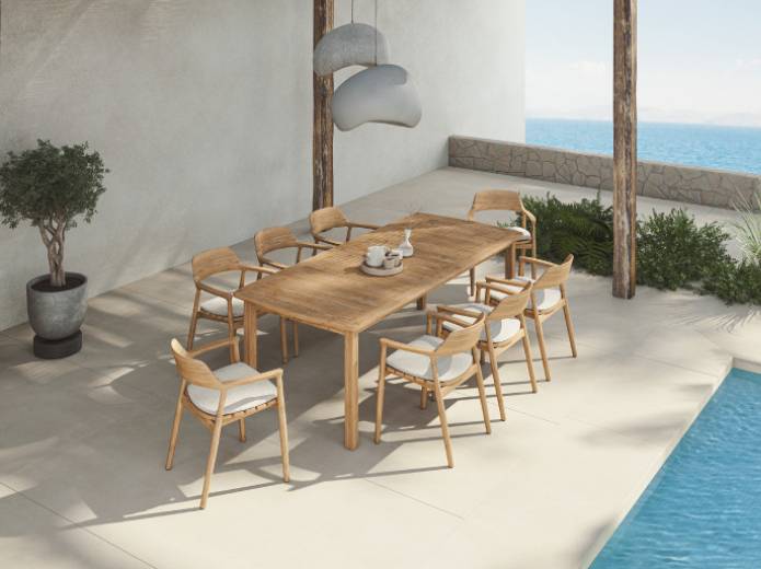 Este conjunto eleva cualquier espacio exterior gracias a la combinación perfecta entre estética contemporánea y la belleza natural de la madera de teca, un material noble reconocido por su resistencia excepcional a la intemperie y su larga vida útil. La mesa, amplia y robusta, se convierte en el centro de todas tus reuniones, aportando carácter y sofisticación.