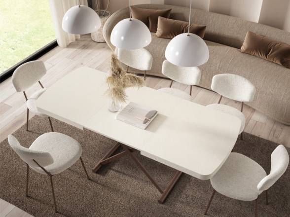 Esta mesa convertible cuenta con una estructura de patas metálicas que aportan un toque moderno y mucha estabilidad. Su tapa en melamina con cantos curvos se adapta a cualquier ambiente. Puedes personalizar los acabados tanto de la tapa de la mesa como de su estructura.