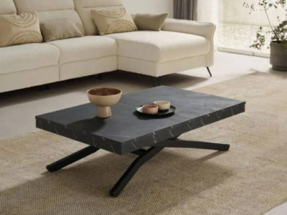 Es una mesa de centro elevable y extensible con sistema eléctrico, diseñada para adaptarse a distintas necesidades en el hogar, permitiendo ajustar tanto la altura como la longitud de forma cómoda y sencilla.