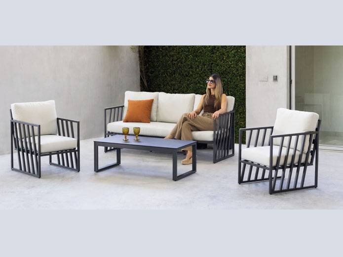 Este set de muebles para terraza está formado por un sofá de exterior de tres plazas y dos sillones de exterior de una plaza. A lo que se suma una mesa de centro para terraza.