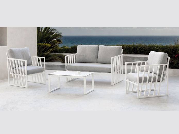 Este set de muebles para terraza está formado por un sofá de exterior de dos plazas y dos sillones de exterior de una plaza. A lo que se suma una mesa de centro para terraza.