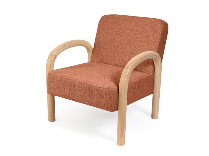 Las patas redondeadas de madera de hevea natural aportan estabilidad y un toque orgánico que complementa a la perfección el tapizado terracota. La combinación entre la madera clara y el tejido cálido crea un equilibrio visual muy actual, perfecto para quienes buscan un mueble con carácter y sensibilidad estética.
