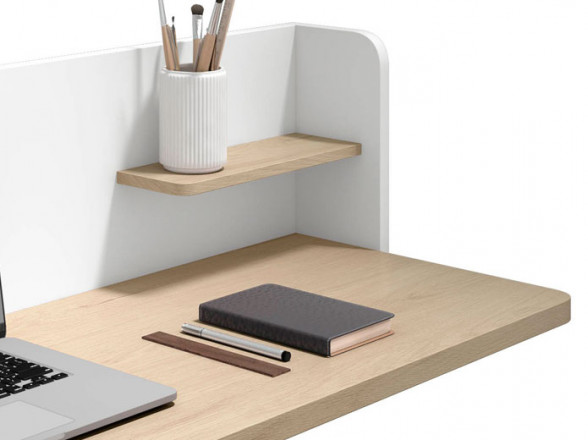 El Escritorio Modelo 24 se trata de un escritorio suspendido, de líneas curvas. Ofrece una gran zona de trabajo o estudio. En su  parte derecha incorpora un estante que te permitirá colocar pequeños objetos como un estuche o un bote para los lápices. De esta forma, la zona de estudio queda más despejada y amplia.